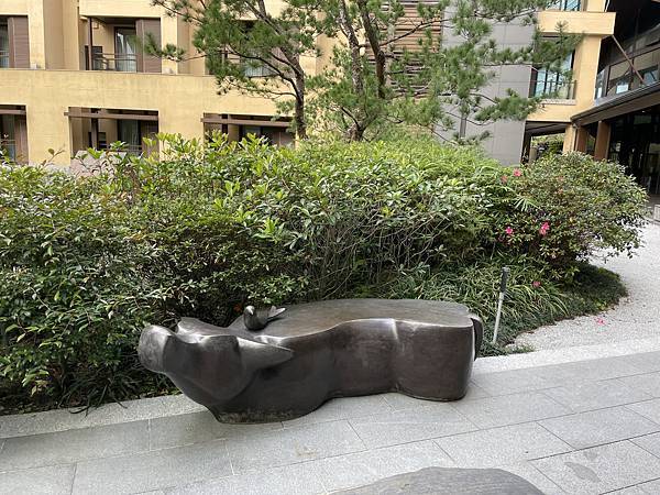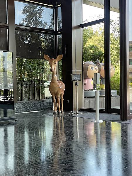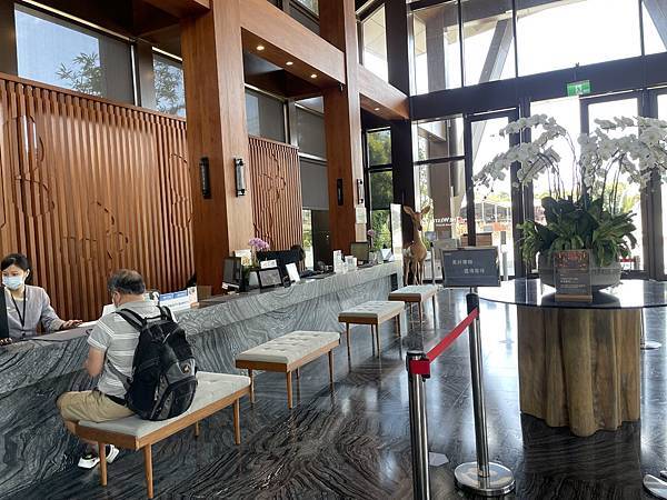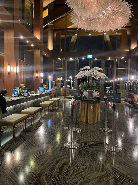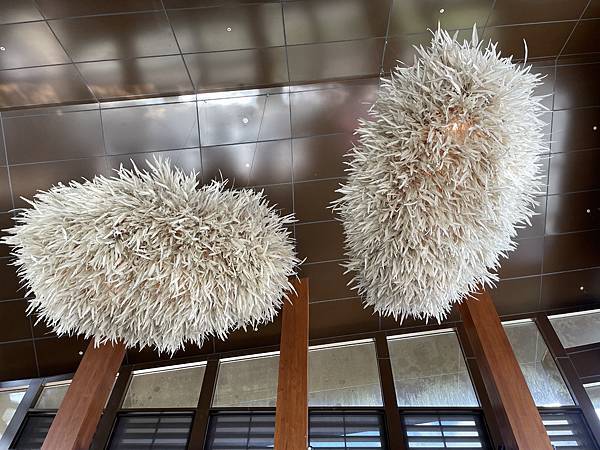 Lobby是木造建築,挑高的設計,中庭放置高雅的花卉,屋頂懸掛著羽毛藝術作品,整體有種寧靜沉穩的溫馨氣息。
