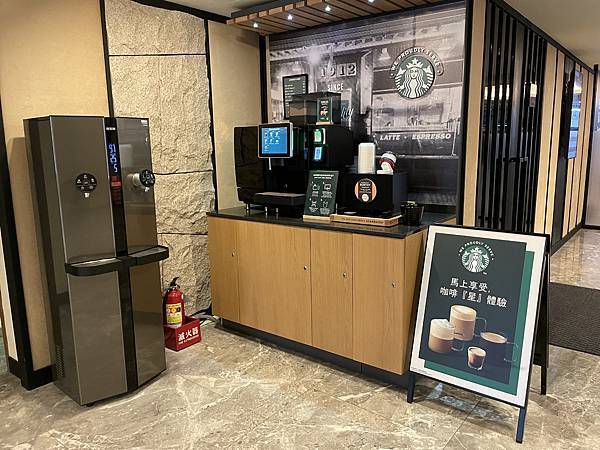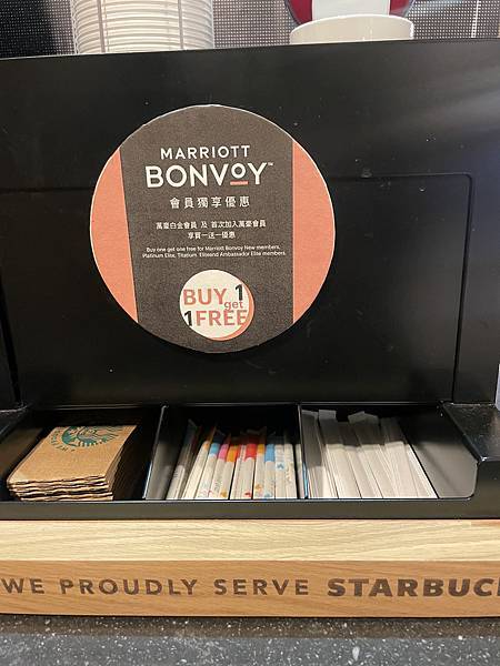 在地下一樓設有Starbucks星巴克咖啡機,萬豪白金會員或首次加入會員可享買一送一的優惠,可到櫃台購買後取杯子到這裡自行操作。